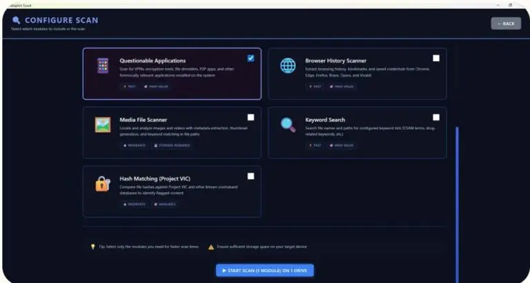 Select which modules to include in your forensic triage scan. Each module is optimized for speed and high-value evidence detection, allowing investigators to customize their approach based on case requirements.